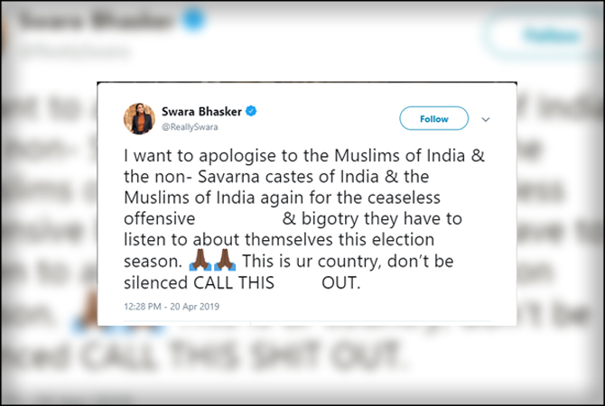 Bollywood star Swara Bhaskar apologises to Muslims during elections
